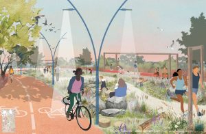 The entries imagine the flyover as a lush green space lined with trees and gardens, which could also become a walking and cycling link.