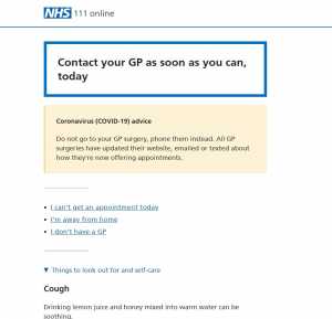 Nevertheless, medical support was prompt, and immediate because once I had finished on the phone within seconds, I received a text message from my GP with a link giving me useful advice and tips on dealing with Covid-19 and self-isolation.