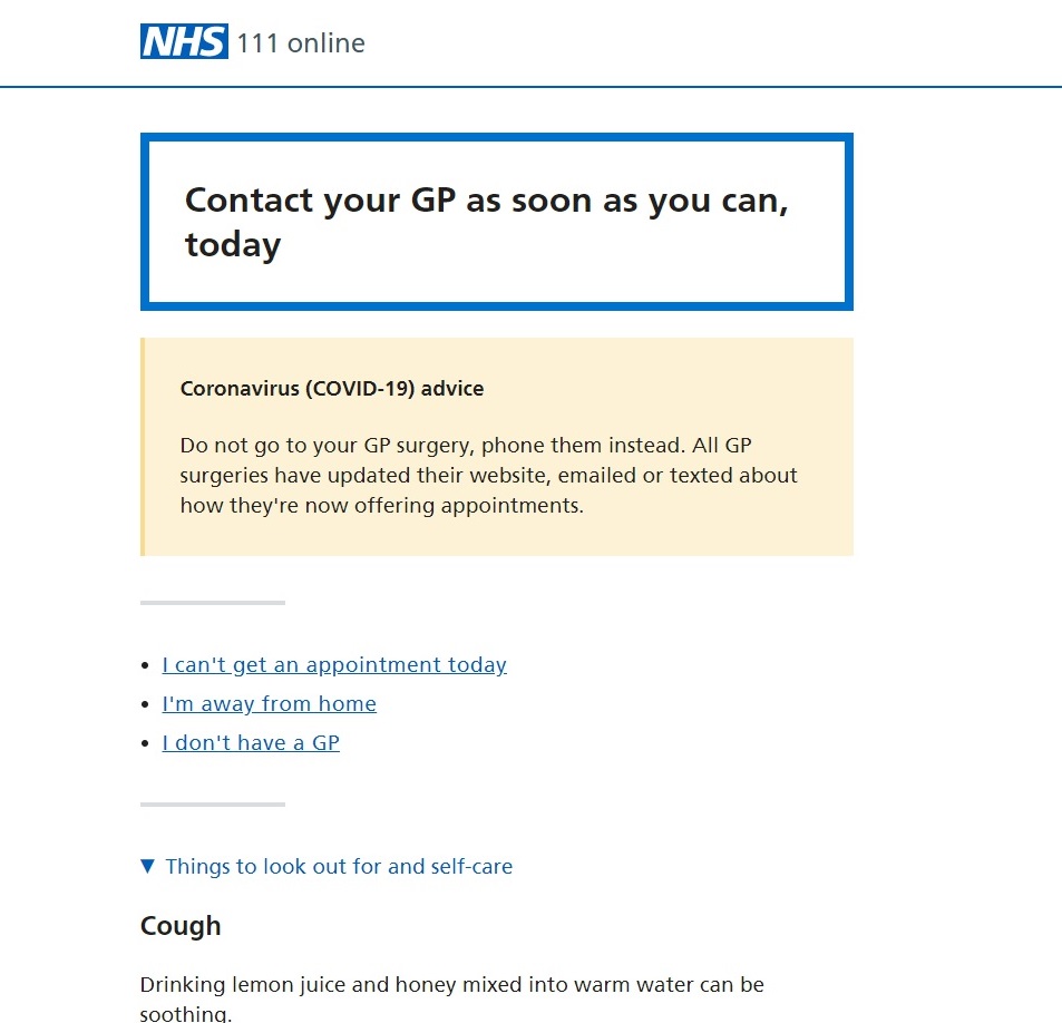 The conclusion from completing the online form was I should call my GP immediately. At first, I thought I will wait for a while and see if the pain and cough calm down, so I made myself a hot lemon and ginger herbal drink. A few hours later, I didn’t feel any different and the pain started getting worse.