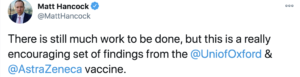 Health Secretary Matt Hancock tweeted: There is still much work to be done, but this is a really encouraging set of findings from the @UniofOxford and @AstraZeneca vaccine.