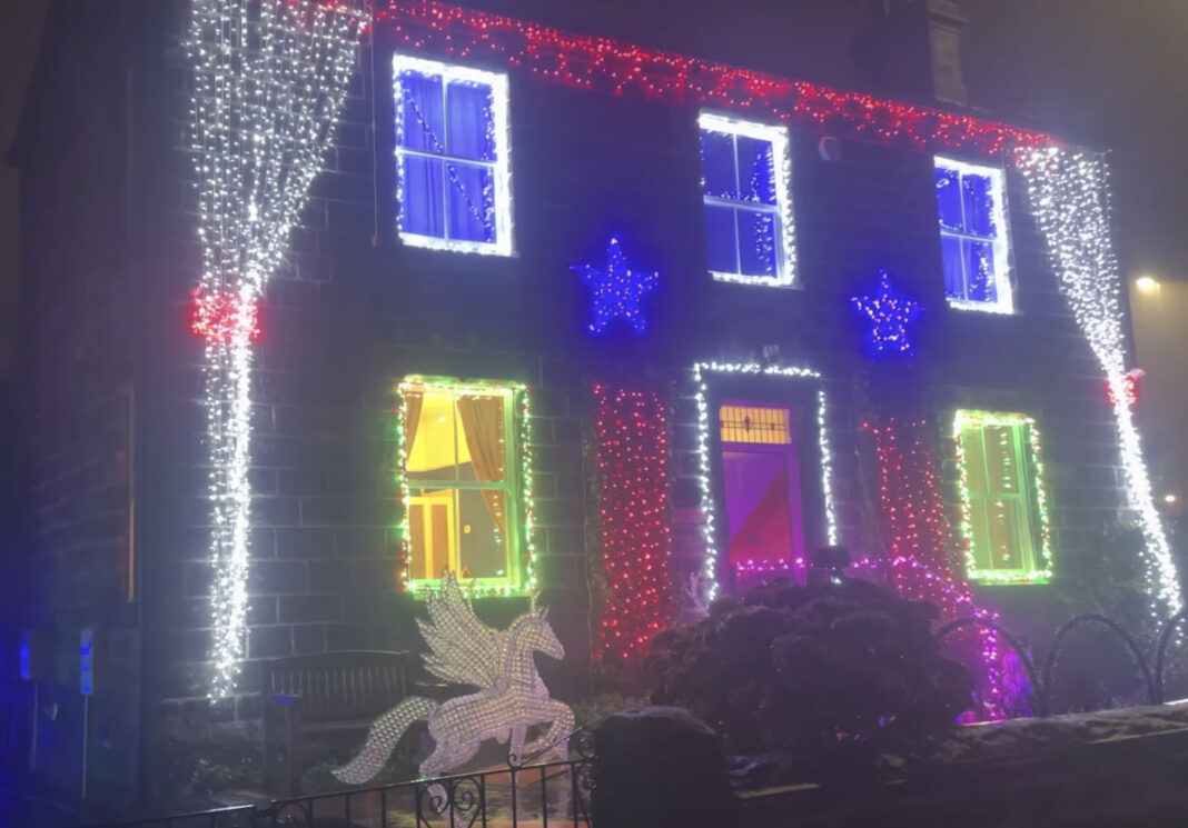 Two times a week-day (at 17:30 and 18:30) and three times at the weekends (16:30, 17:30 and 18:30pm) their detached Yorkshire stone house comes alive with the sound of music and a co-ordinated light show in aid of Bradford Hospitals’ Charity.
