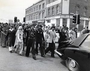 Image: Mike Hollist/Daily Mail/Shutterstock. Crowd following the hearse at the funeral of Blair Peach. Southall protest