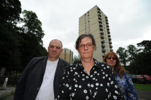 The Greens’ Karen Allison, with group colleagues Sue Lee-Richards and Andrew Cooper, at Berry Brow in Huddersfield where tower blocks are to be demolished as part of a £90m housing upgrade. Image: A Cooper.