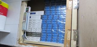 Illicit tobacco was hidden in the small rear stockroom above the door. A total of 5,980 cigarettes & 27 packets x 50g Hand Rolling Tobacco was seized.
