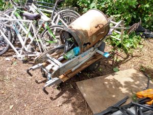 He says he’s a trained electrician, knows how to fix bikes, and needs work. He’d even fashioned a makeshift cart to carry his tools.