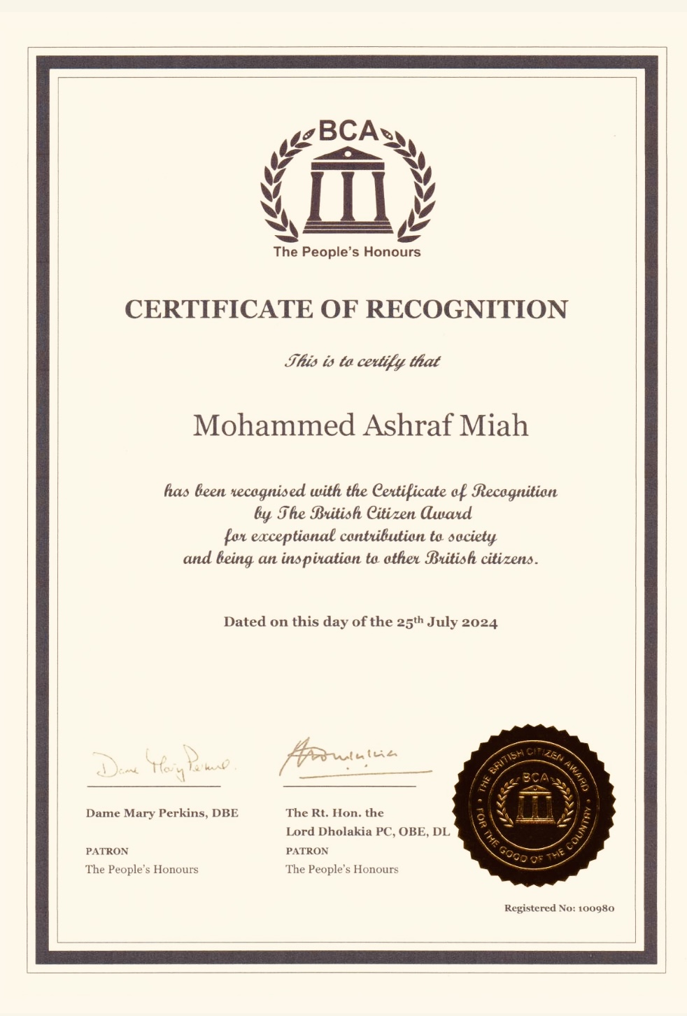 Upon receiving the BCA Certificate of Recognition, Mr Miah expressed heartfelt gratitude and emphasised the significance of the award. “I would like to thank my nominator for bringing my work to the panel’s attention. Receiving this special certificate from the British Citizen Award is a great honour. While recognition was never the goal, this award motivates and encourages others in our society to continue their hard work. It’s a reminder that our efforts do make a difference.”