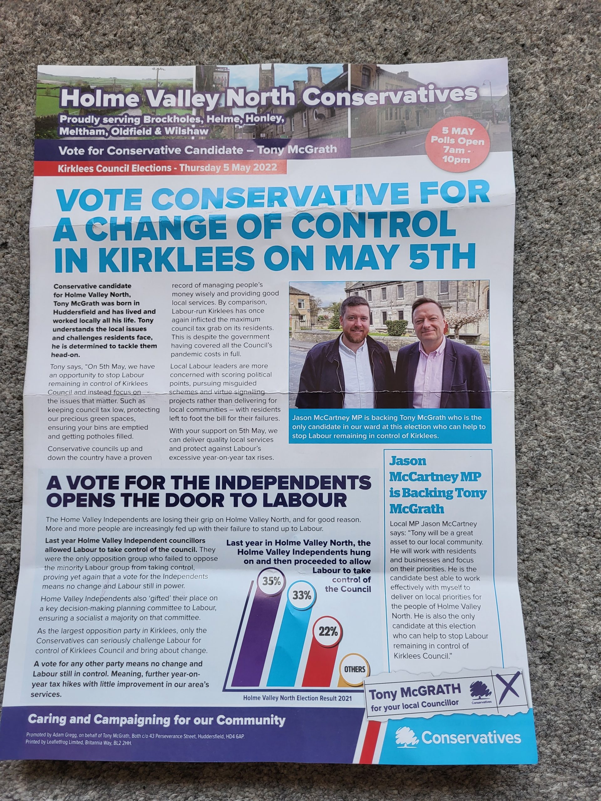 The front page of the leaflet, produced by the Tories for Holme Valley North candidate Tony McGrath, also says the three-member independent group “gifted” their place on a planning committee to Labour, “ensuring a socialist majority on that committee.”