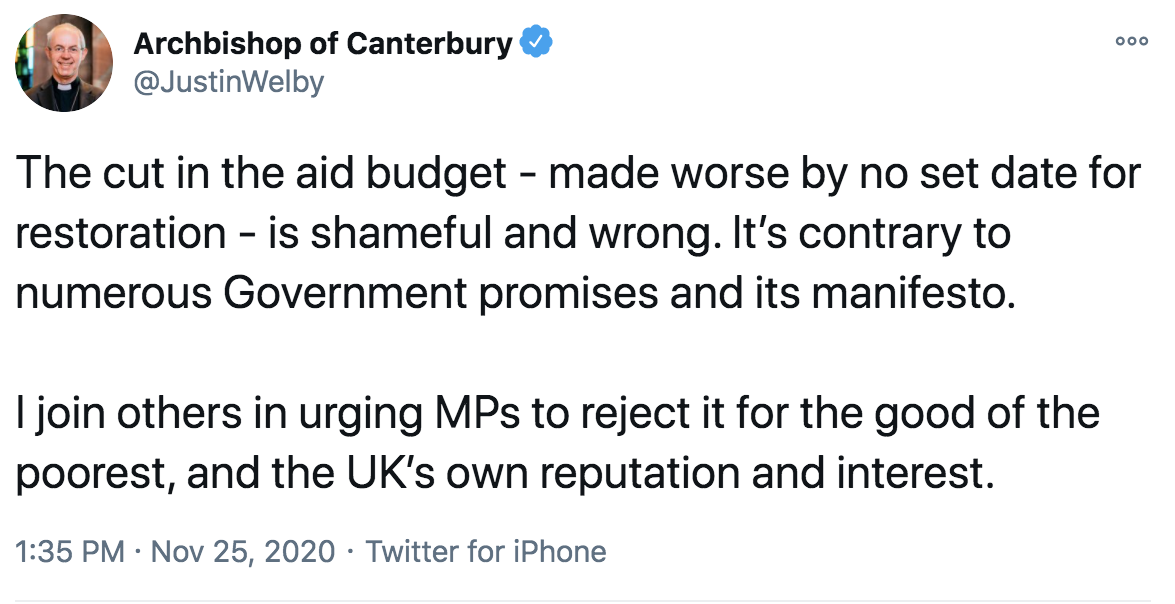The decision has drawn criticism from The Archbishop of Canterbury, taking to Twitter, Justin Welby said: “The cut in the aid budget – made worse by no set date for restoration – is shameful and wrong.