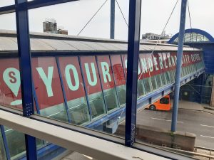 The elevated pedestrian bridge links St Mary’s Multi-Storey Car Park to High Street West, via a glazed space which sits between Sports Direct and the former M&S building.