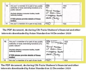 After Asian Standard questioned Cllr Shaheen on 21 Dec, the form was subsequently changed, with an addition in the section asking: Are you a member of or part of any public authority or body exercising functions of a public nature?