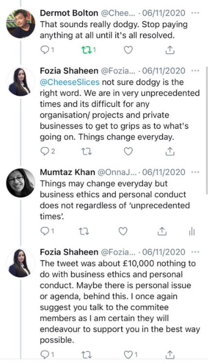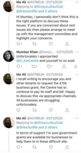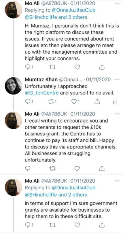 On 31 October 2020 Mumtaz tweeted @ OnnaJuJitsuClub asking Susan Hinchcliffe and Naz Shah MP for support in connection with being charged full rent by Girlington Community Association (Centre). @samuelkirby replied to @OnnaJuJitsu on 6 November saying: “The centre will of qualified for the £10,000 rate relief grant from the council. Part of the conditions of that grant is that if you have tenants you are to pass some of it on by means of savings against rent. That’s what we did at Sutton.” @OnnaJuJitsuClub replied: “That’s interesting because they have not passed any of it onto me! @SHinchcliffe @NazShahBfd @kersten_england @ FoziaShaheen3 Can we please have some from @bradfordmdc look into this? @ Bradford_TandA”