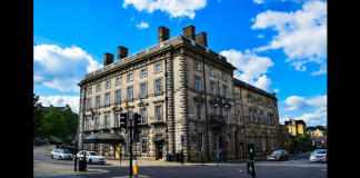 The Britannia buildings take up a prominent position in Huddersfield, sitting across from the George Hotel on St George’s Square.