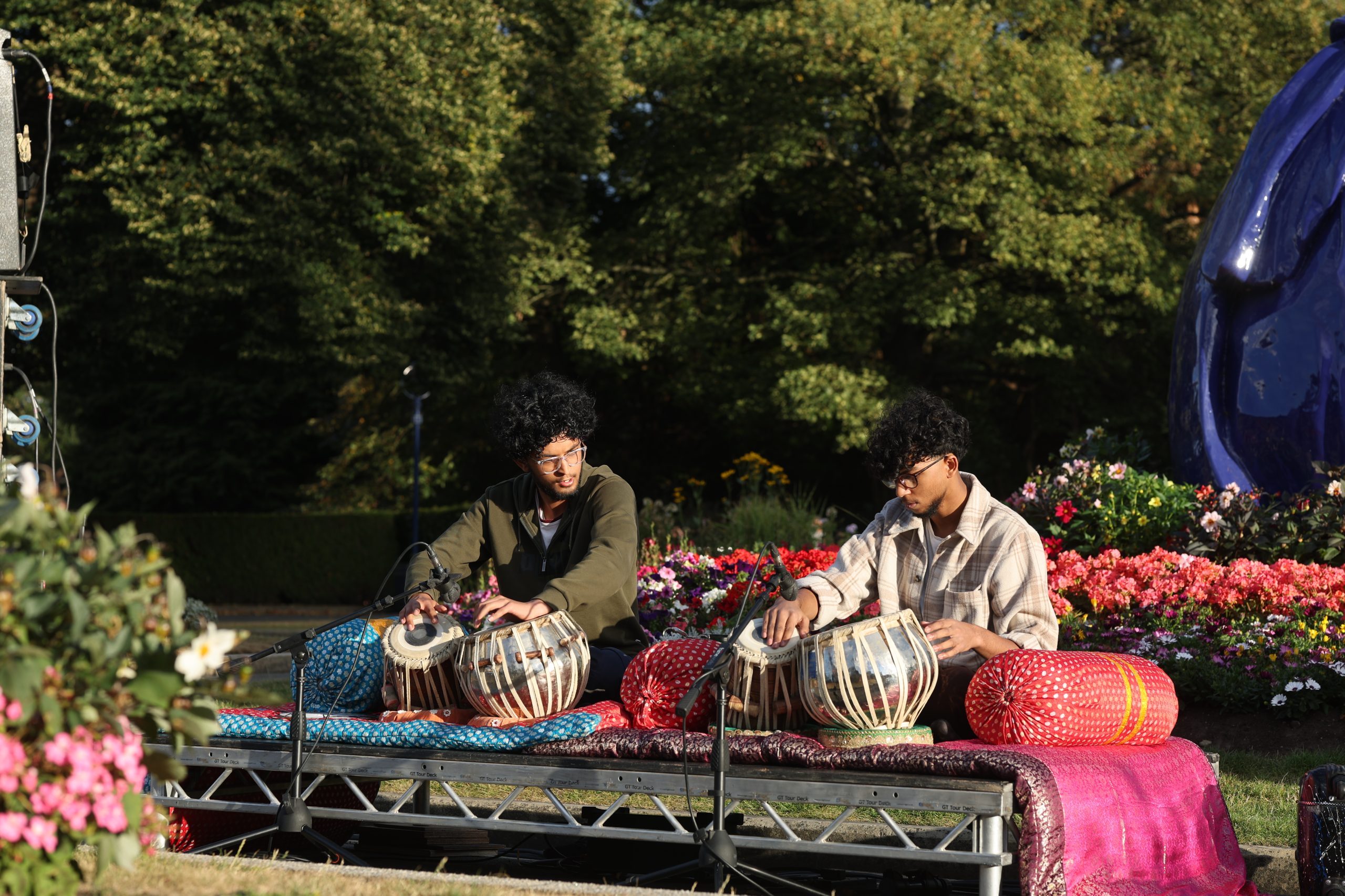 Ali Hashim and Kayam Hussain captivate the audience with a spellbinding live tabla performance, continuing the legacy of their father, renowned maestro Shahbaz Hussain. Image: Junaid Khan and Jaan Shah