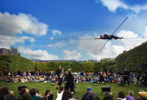 Playing with the codes of traditional performance, Soka Tira Osoa brings together riggers, musicians, sound engineers, a tightrope walker, and the audience, in their participatory show, which explores the theory that ‘What brings us together, makes us stronger’.