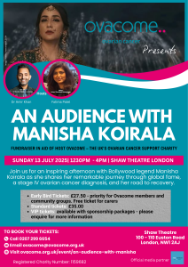 Ovacome, the UK’s ovarian cancer support charity, will host ‘An Audience with Manisha Koirala’ at the Shaw Theatre in London, on the afternoon of Sunday 13 July 2025. This intimate and moving event will give attendees the rare opportunity to see Manisha Koirala in person as she reflects on her remarkable life—from global fame as a Bollywood icon to the deeply personal challenges she faced following her diagnosis with ovarian cancer. Manisha will be interviewed by our very own Editor, Fatima Patel, and Dr Amir Khan, who is an NHS GP, bestselling author and a TV doctor on Good Morning Britain and Lorraine.